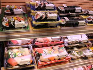 お寿司は大人用と子ども用のわさび抜き両方をカゴへ。子どもが好きなサーモンの巻き寿司もチョイス
