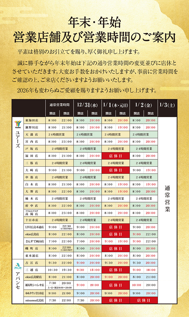 年末年始 営業店舗及び営業時間のご案内